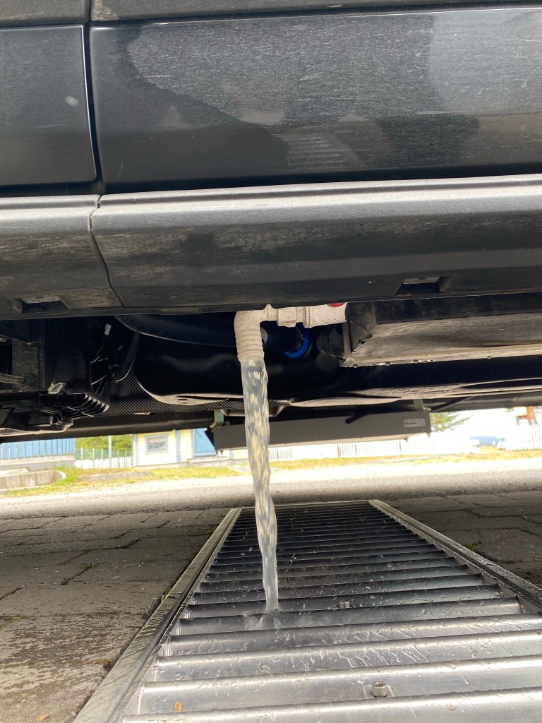Da cha mä nid eifach Türä zuä und tschüss….. nei, da mues mä scho no chli öppis tuä💪🏻!! Alläs im CHlapf wieder näggelisicher machä (nüt dörf umäflüügä), Abfall entsorgä, sNavi programierä und……… sWC leerä, Grauwasser (Abwasser) ablaa und Früschwasser füllä (wüssäd ja nid wo mir anä chömäd!! Vielicht düend mir wild Campä und dänn bruuchäd mir Wasser)
