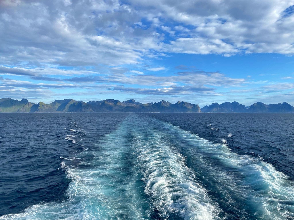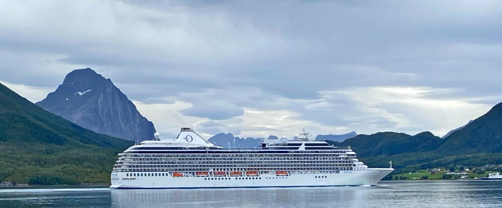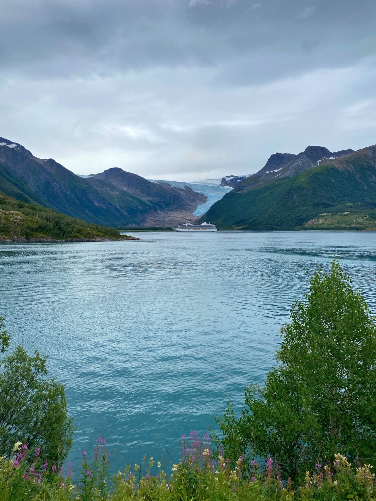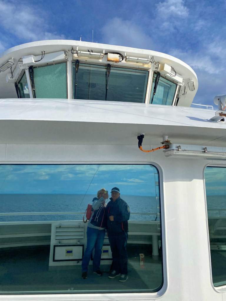Ganz chli gseht mä no äs Chrützfahrtschiff 🛳️!! Das isch Marina und diä sind äxtra wäg dem Gletscher det hinderä tückerät und jetzt wieder zrugg……. Mir stönd da am Hafä und wartäd uf Fährä für uf diä anderi Siitä….., detä suechäd mir dänn wieder äs di Hei für ä Nacht.