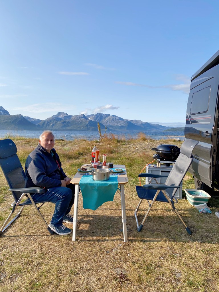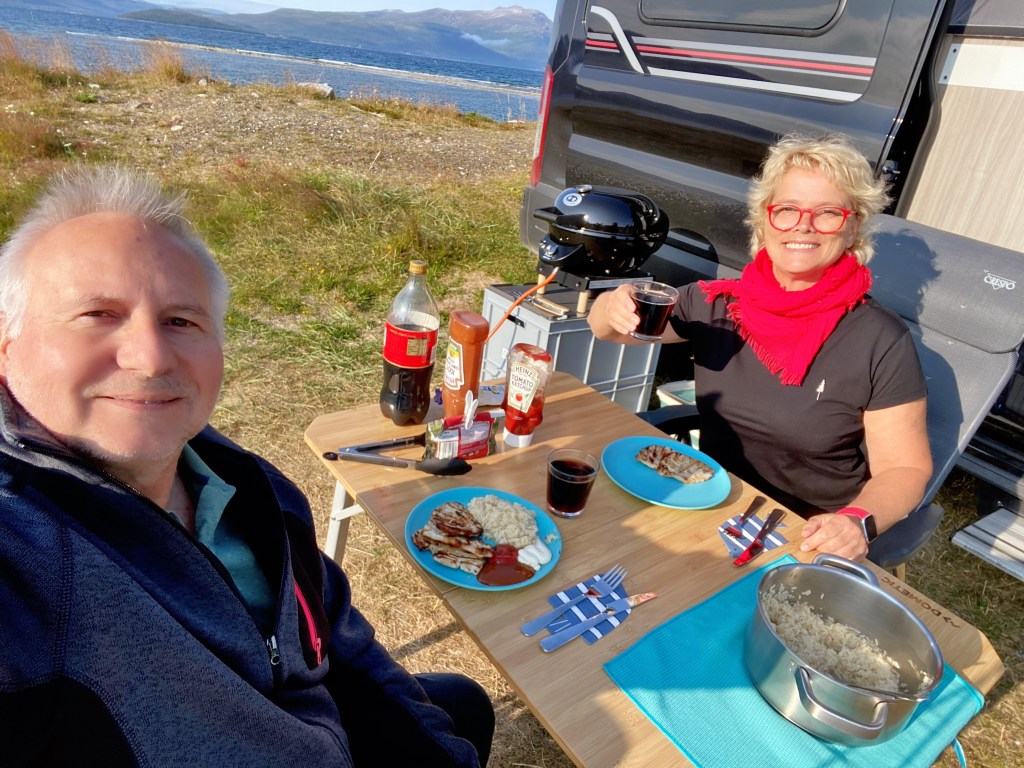 Hüt hämmer dä ganz Tag nüüüüüüüt gmacht!! Pausä vom fahrä, vom Züg aluegä, vom Stellplatz suechä……. PAUSÄ!! Schööön gsie…… bin chli am Meer unä gsie und han Ebbe und Fluet gstudiert. Dä Liegestuhl, ä warmi Decki, Sunnäbrüllä, äs Buech und ich, händ am Namitag zämägfundä☺️ Han vergässä mis Gsicht igremä….. tja, jetzt rot🥴 Mir händ mega schöööns Wätter da….. blauä Himmel und Sunnä schient☀️ än Traum mit 10 Grad!!! Ahhhh…… dä Mike hät au Pausä gmacht!!! sGliechä wiä ich, nur ohni Meer, ohni Decki (isch au mini🫣) und ohni Buech!! Zu mä nä Bier simmer vo euisnä Stellplatznachberä igladä wordä…… gits garn nid!!!! Diä chömäd vo Wisädangä!!! dWält isch chli……. Spöter hämmer no Pizza gmacht uf äm Grill….. fein gsie🥰 Bim ässä isch no sHurtigruten-Schiff durä gfahrä (oder seit mä gschwummä🤔) Han gwunkä, mä weiss ja niä wär so druff isch🤗