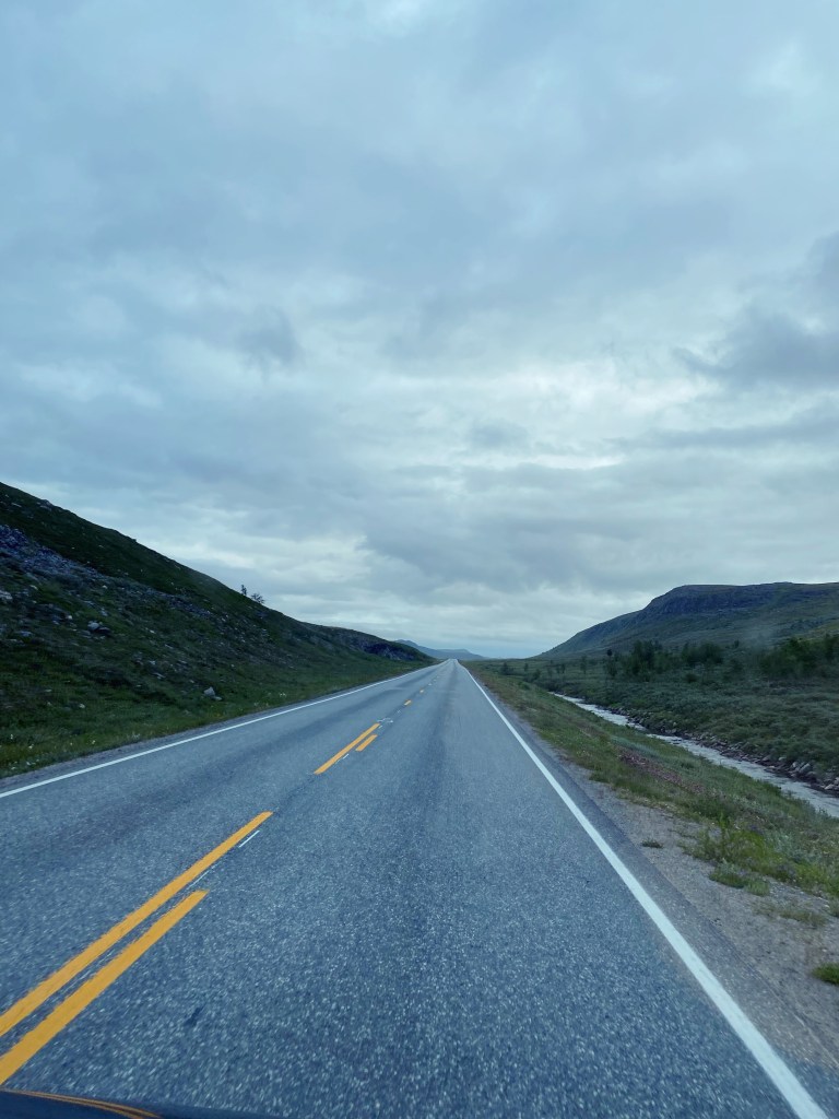 Hüt morgä am eis dä CHlapf uf än Parkplatz gstellt……. und am 6si simmer scho wieder uf dä Strass!! Ehrlich gseit, han ich mir sWild Campierä chli romantischer vorgstellt……. so amä See, chli absiits vo dä Strass, no chli dussä höcklä, äs Gläsli Vino und so…..😉!! Aber das isch jetzt än Parkplatz gsie mit Lästwägä, irgendwelchi abgstellti Fraks und no anderi unromantische Camper😂!! Nach ärä churzä aber guetä Nacht (extremä hellä Nacht☀️) simmer jetzt wieder Richtig Nordkap unterwägs💪🏻 So öppä i 3-4 Stund simmer detä…..💃💃💃💃💃💃. Also 🌲🌳🌲🌳🌲🌳🌲🌳🌲häts kei meh da…… nur no grüen und natürlich Flüss und chlini Seeä. Fahräd über Hügel, chli wiä i dä Schwiiz, nur grüener.